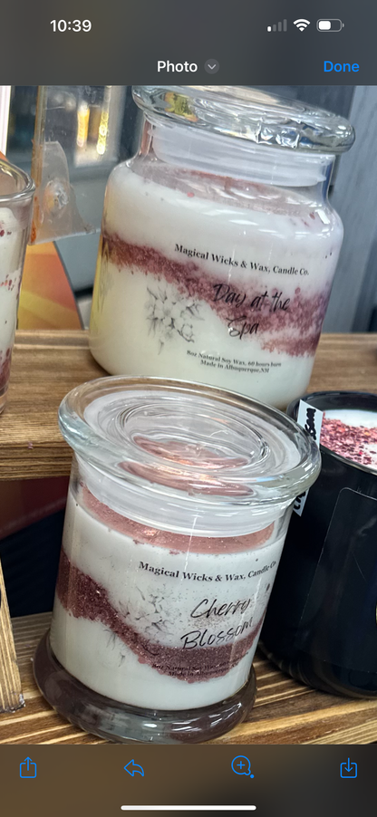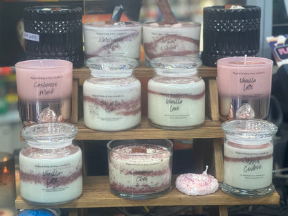 12oz simply Elegant straight sided status jars with a heavy flat top glass lid. These candles are poured with 100% Natural Soy wax and pet friendly Fragrance oils, magical Glitter swirled throughout. They will burn for 60 hours of safe even burn with zero wastage. The simplicity of there Candles is completely breath taking..